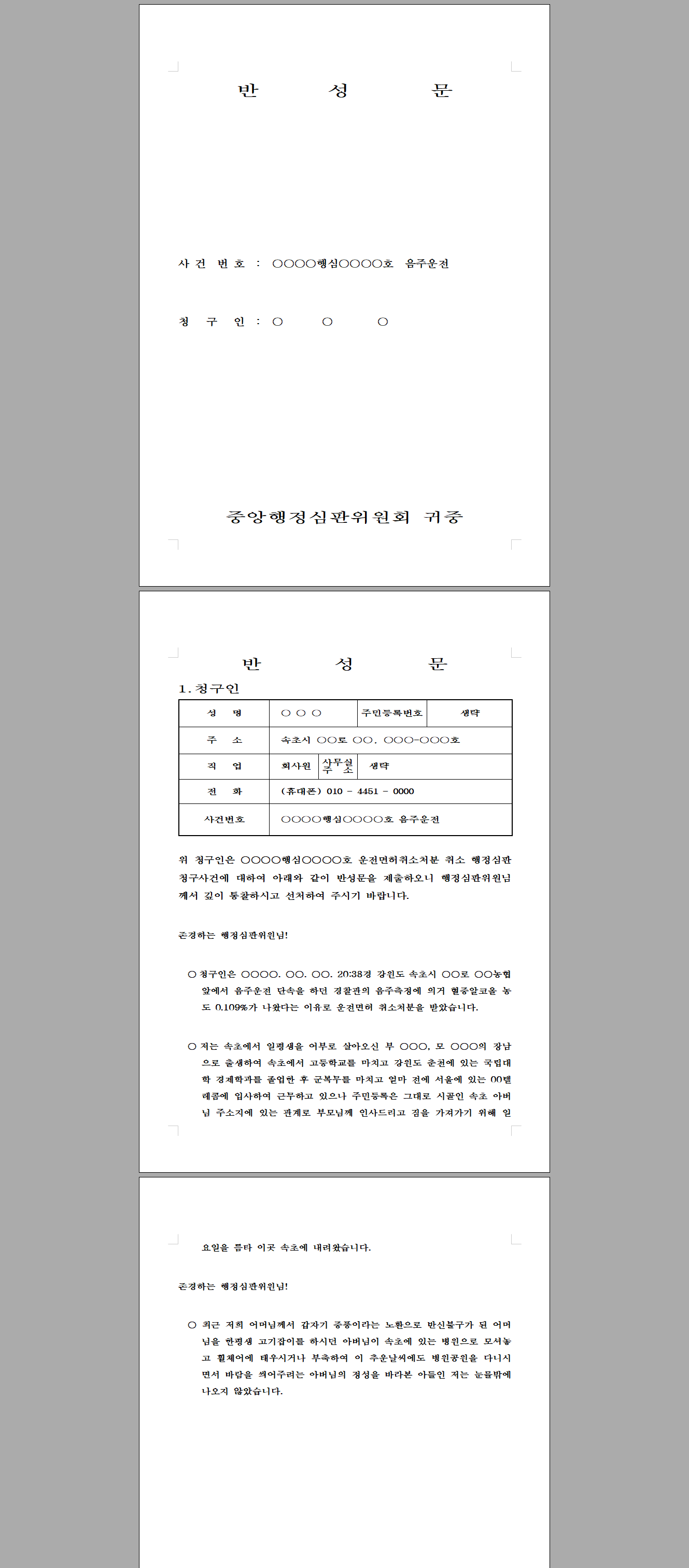 | 23 | 반성문 | 23.반성문 - 음주운전 면허취소 행정심판청구 피치못할 사정으로 지방행정심판위원에게 면허취소 구제호소 반성문 | 22,000 | 신청하기 | |