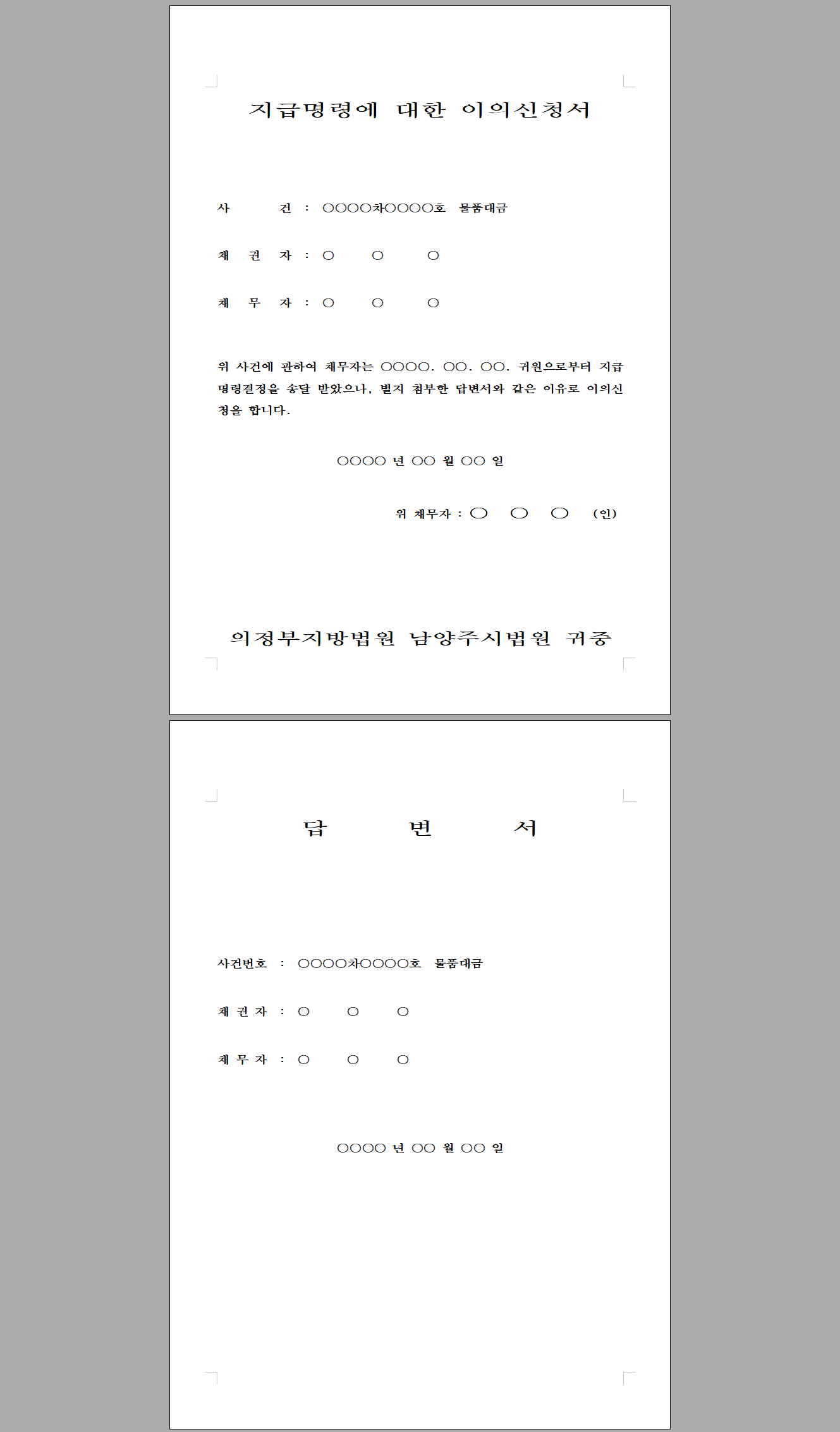 | 22 | 이의신청서 | 22.이행권고결정에 대한 이의신청서 - 답변서 포함 원고의 처에게 변제하여 청구기각을 구하는 답변서 | 8.000 | 신청하기 | |