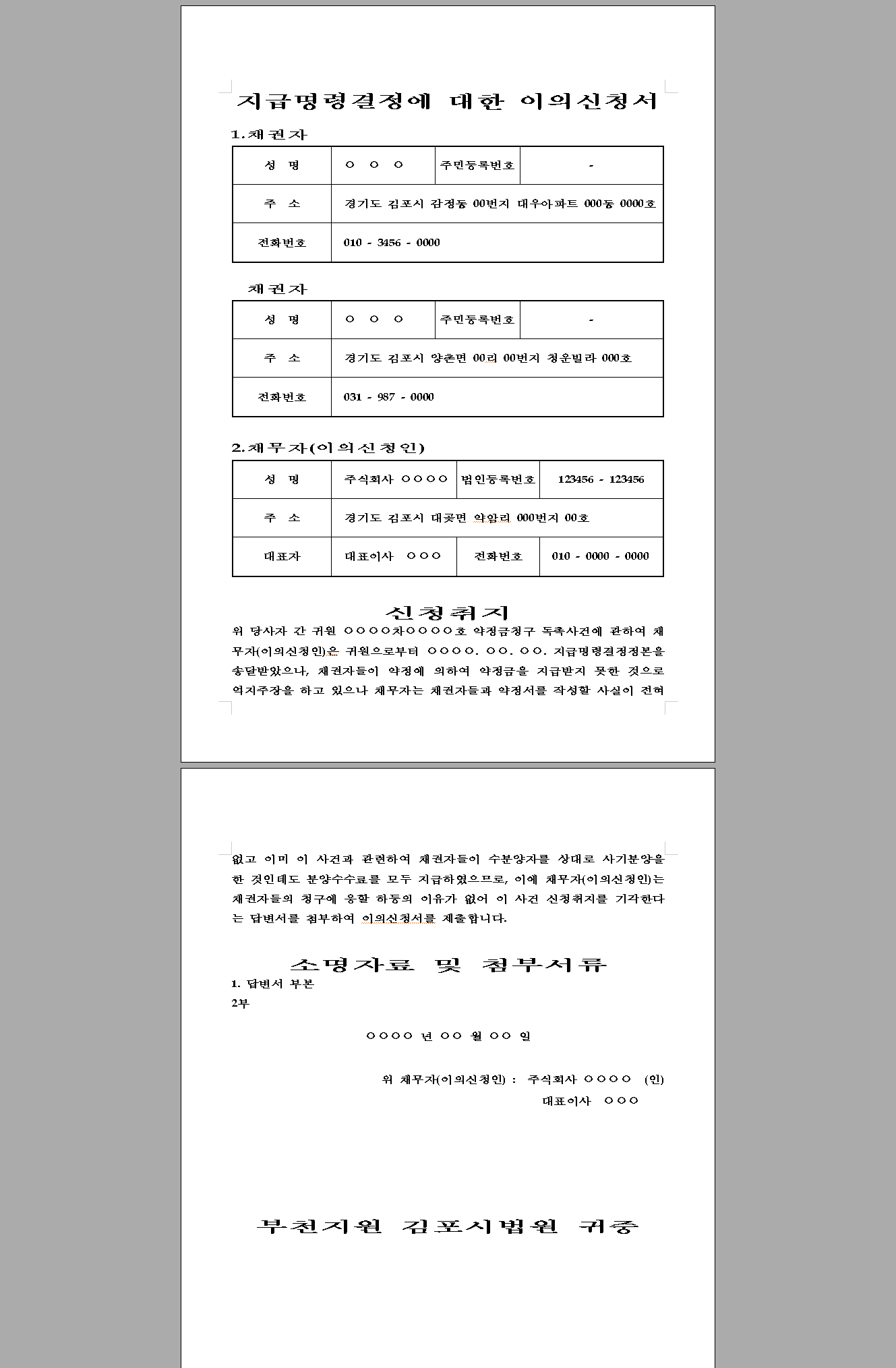 | 63 | 이의신청서 | 63.지급명령결정에 대한 이의신청서 - 대여금청구 지급명령결정 이미 모두 변제하여 청구기각 구하는 답변서 포함 | 8,000 | 신청하기 | |