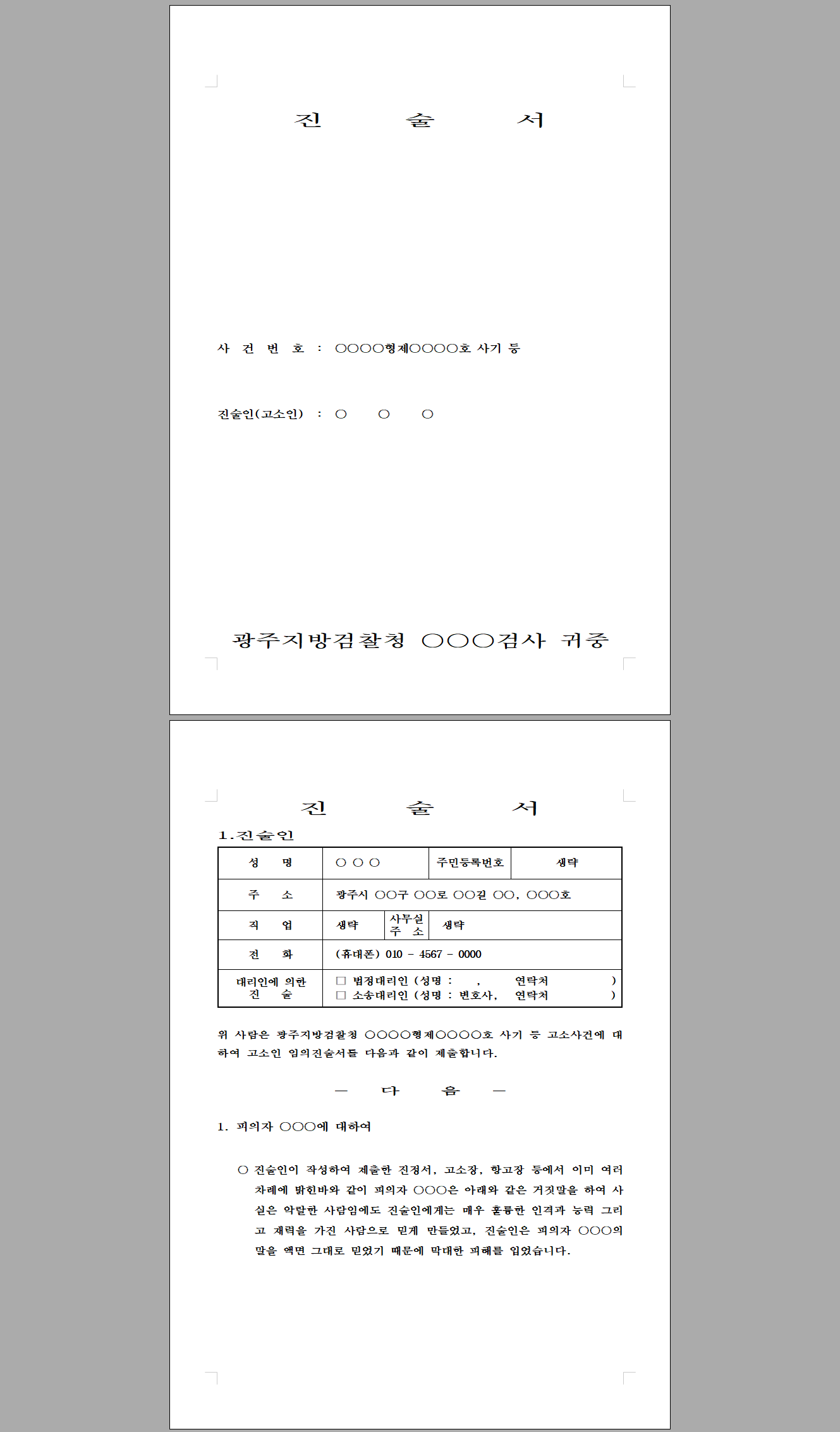 | 12 | 진술서 | 12.진술서 - 고소인 임의진술서 고소 후 알게된 사실을 제출하고 담당 검사에게 수사촉구 진술서 | 20,000 | 신청하기 | |