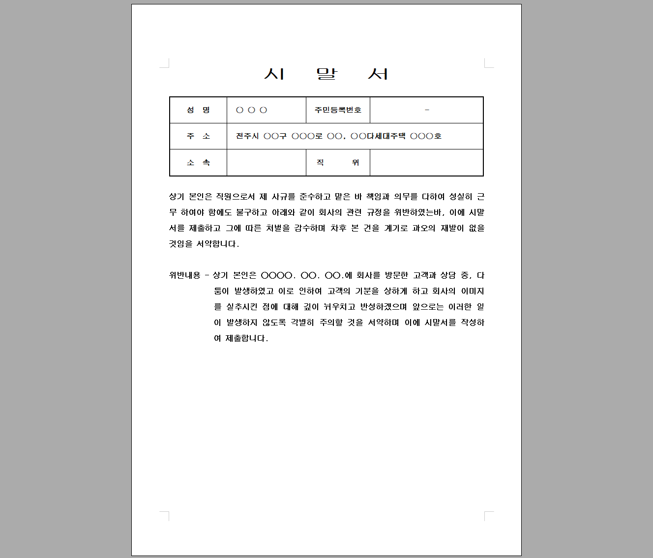 | 89 | 기타서식 | 89.시말서 - 직원 교육장에서 술을 먹고 동료들과 시비를 붙고 싸움하여 다시는 이런일 없도록 하겠다는 시말서 | 8,000 | 신청하기 | |