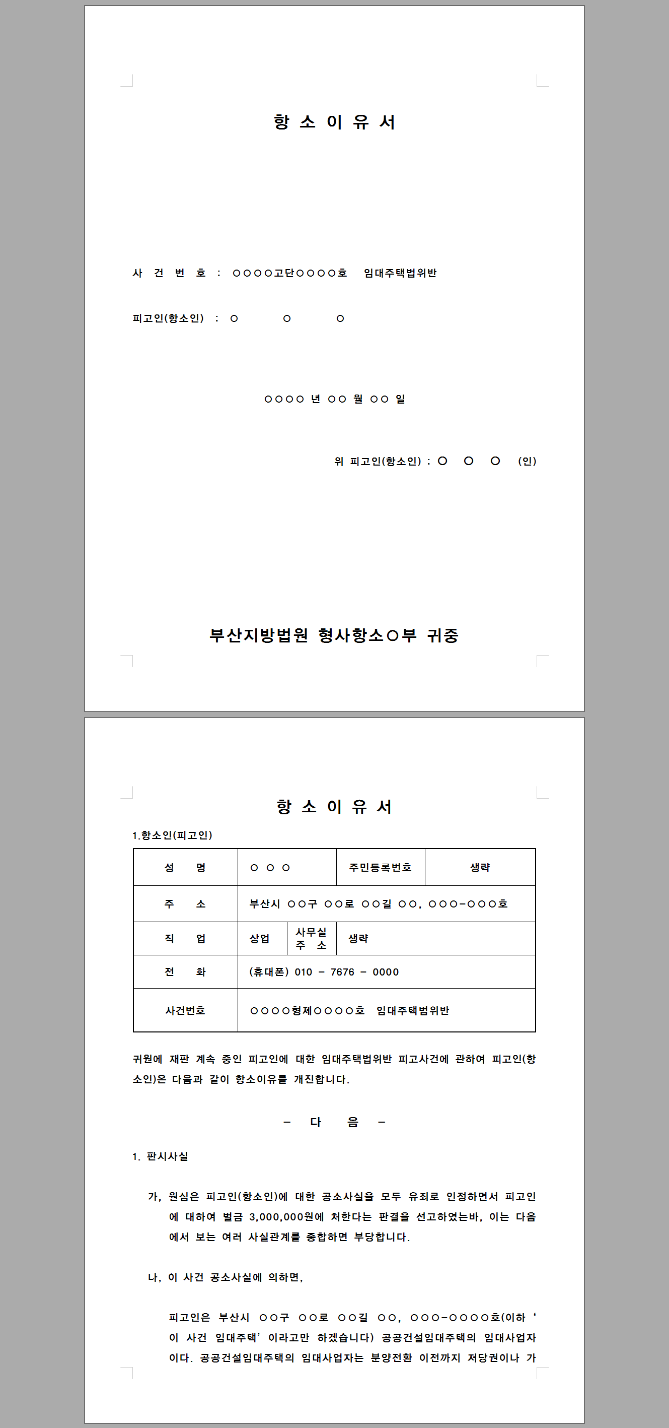 | 20 | 형사항소 | 20.형사사건 항소이유서 - 횡령으로 집행유예 선고받고 합의서 제출 하고 벌금으로 선처호소 | 50,000 | 신청하기 |