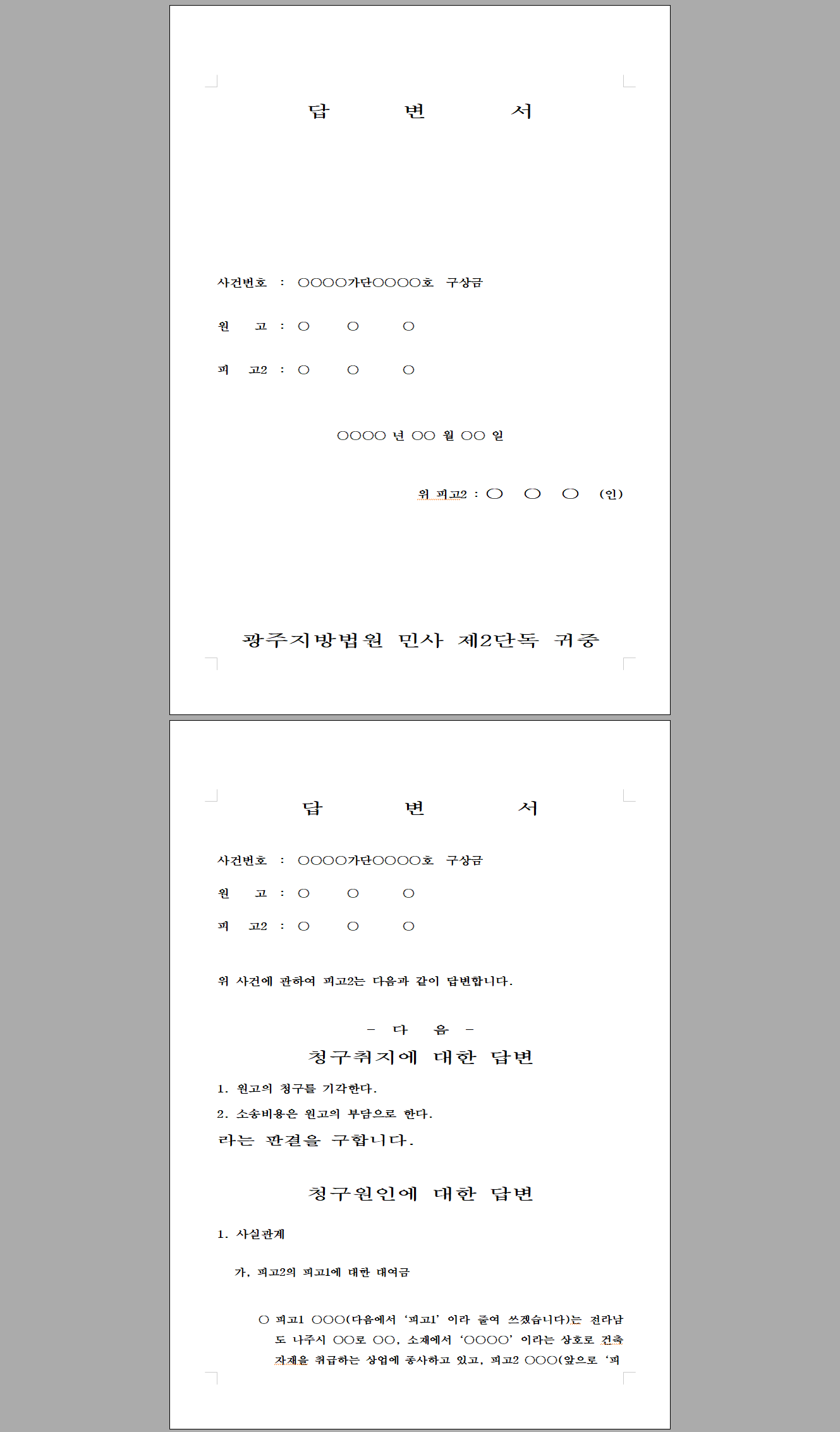 원고의 청구를 기각해 달라는 답변서원고는 건물의 존재를 전제로 한 원상회복에 따른 손해배상을 구하고 있으나 피고가 임대차계약을 체결할 당시 이 사건 건물은 존재하지 않았음에도 원고의 원상회복 주장은 더 나아가 이유가 없으므로 원고의 청구를 기각해 달라는 답변서